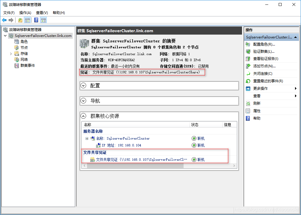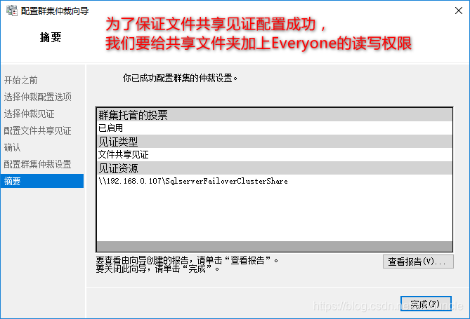 見證共享文件夾是Windows 2008才推出的見證磁盤方式,因為以前的見證磁盤(簡稱仲裁盤)需要共享存儲,也就是各個節點需要掛載同一個磁盤,這個磁盤叫見證磁盤,是放在共享存儲上面的。推出見證共享文件夾之后我們可以不需要高大上的共享存儲,用共享文件夾即可。