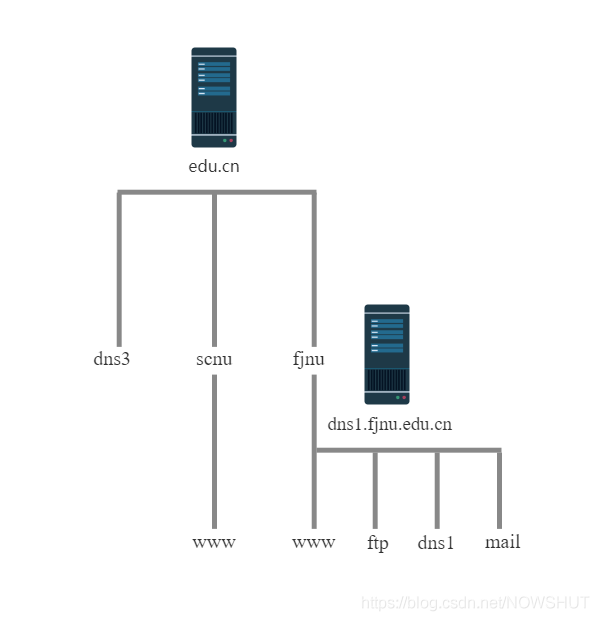 同時可以直接在edu.cn下創建該域的主機記錄,如:dns3.edu.cn,即本域名服務器的域名,其對應IP地址為192.168.83.203。Server3可以自己解析下級子域的主機,也可以將下級子域的解析委派給下級域名服務器,如將fjnu.edu.cn委派給該域的域名服務器Server。
