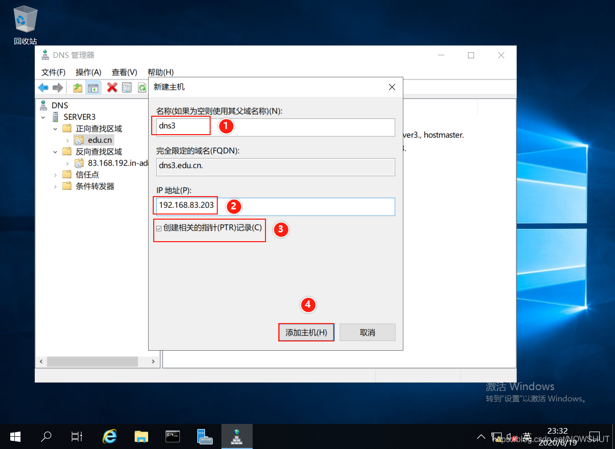 (10)進入【新建主機】界面,在【名稱】中輸入:dns3,輸入域名對應的IP地址:192.168.83.203,勾選最下面的【創建相關的指針記錄】,自動在反向區創建與該主機記錄對應的指針記錄。