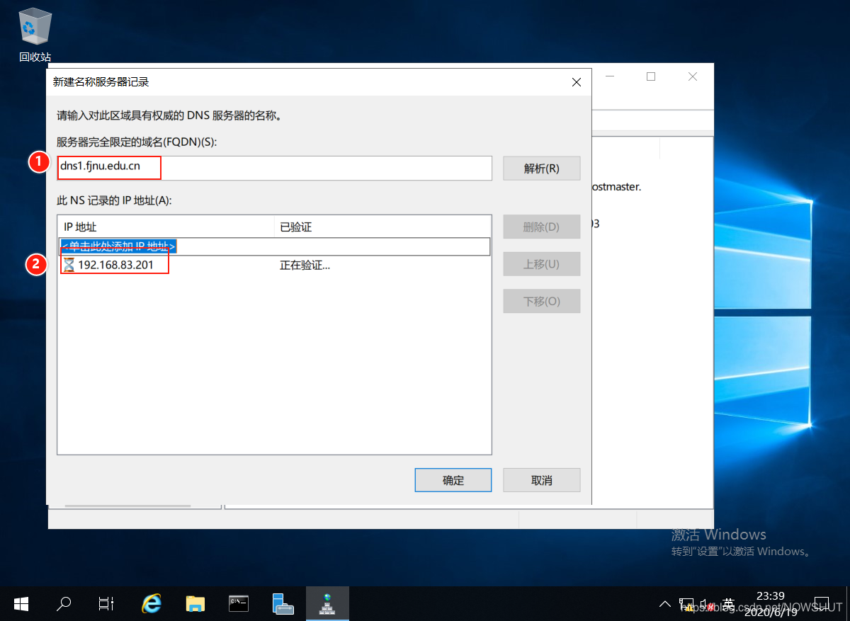 (5)在【服務器完全限定的域名】中輸入:dns1.fjnu.edu.cn,并在下面添加該域名對應的IP地址:192.168.83.201,單擊【確定】。