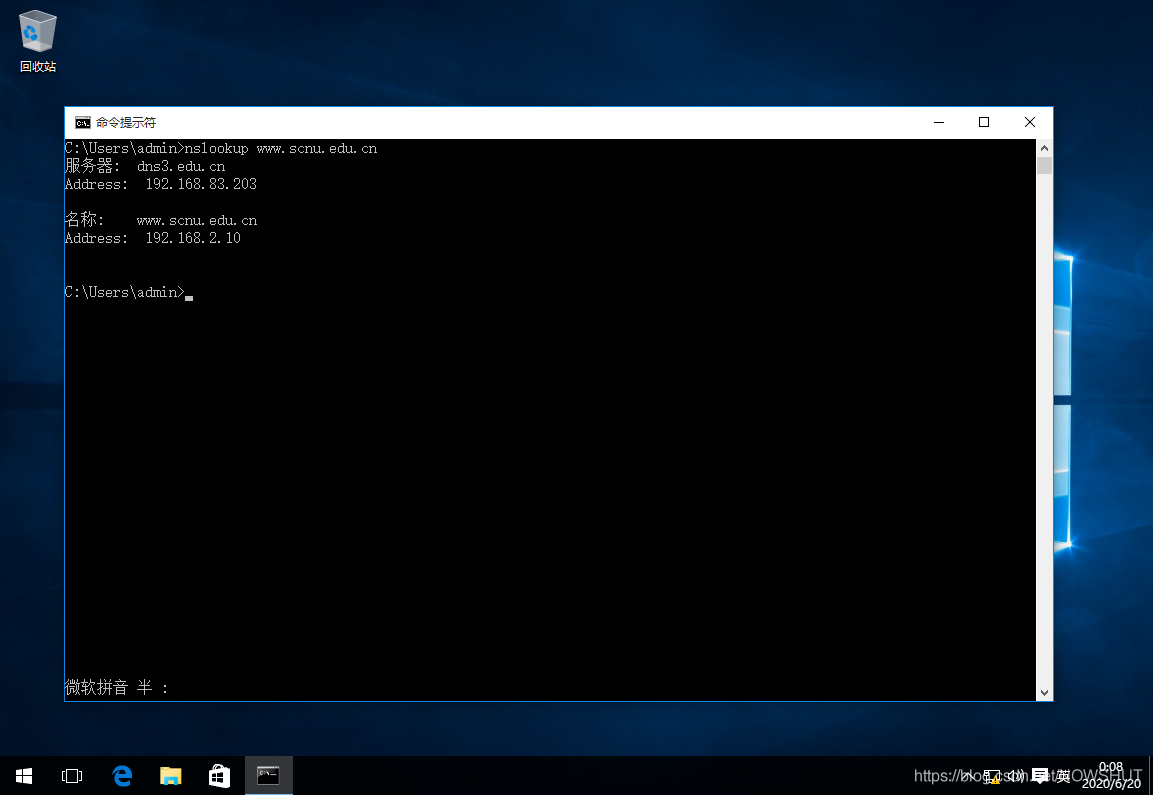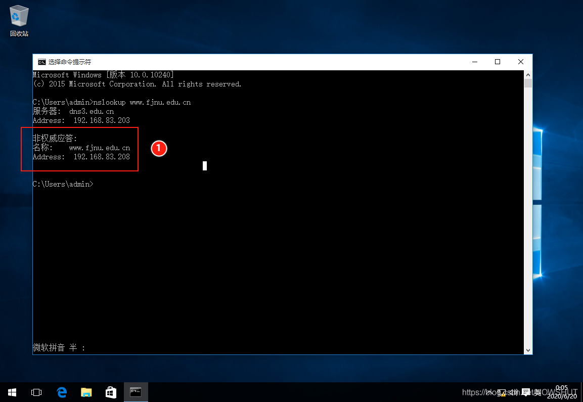 (2)打開cmd終端,輸入命令nslookup www.fjnu.edu.cn,解析到該域名對應的IP地址:192.168.83.208,Server3 將 fjnu.edu.cn 子域的解析委派給了 dns1,Server3 返回給客戶機的解析結果是從 Server 上查詢到的,因此返回的是非權威應答。