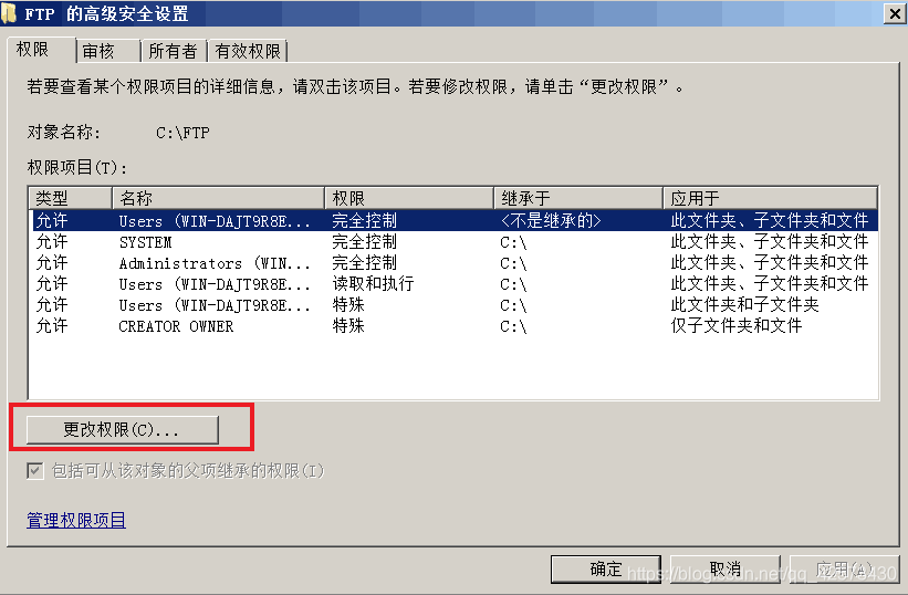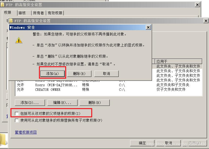 瀏覽打開FTP站點指定的主目錄,右擊空白處單擊屬性,選擇安全,為保證FTP用戶權限分配明確,最好把除了administrator之外的用戶刪除,也可以不刪除,單擊高級,選擇更改權限,并將包括可從該對象的父項繼承的規則的勾選去掉,單擊添加