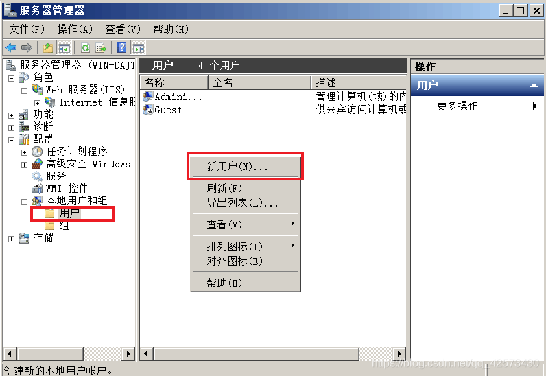 6.添加FTP用戶,打開服務器管理器,右擊用戶選擇新用戶zhangsan