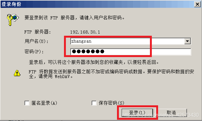 3.右擊public文件夾空白處,單擊登錄,輸入用戶zhangsan的用戶名和密碼,會登錄到文件夾zhangsan,可以上傳或下載文件