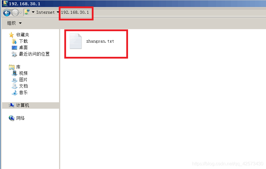 2.打開計算機,在搜索框輸入ftp://192.168.30.1 IP地址為FTP服務器的IP地址,匿名用戶登錄時只能登錄到public文件夾