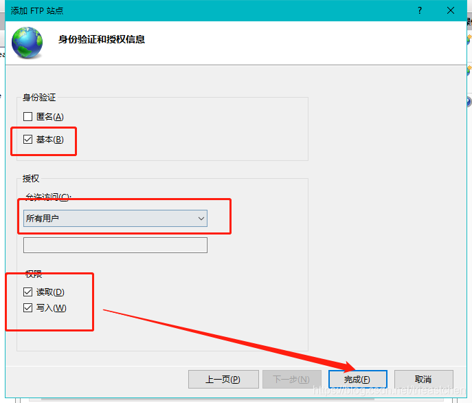 4)勾選基本身份驗證(匿名是否勾選根據實際情況選擇,此處方案不允許匿名登錄,不勾選),選擇允許所有用戶訪問,勾選讀取、寫入,單擊完成。
