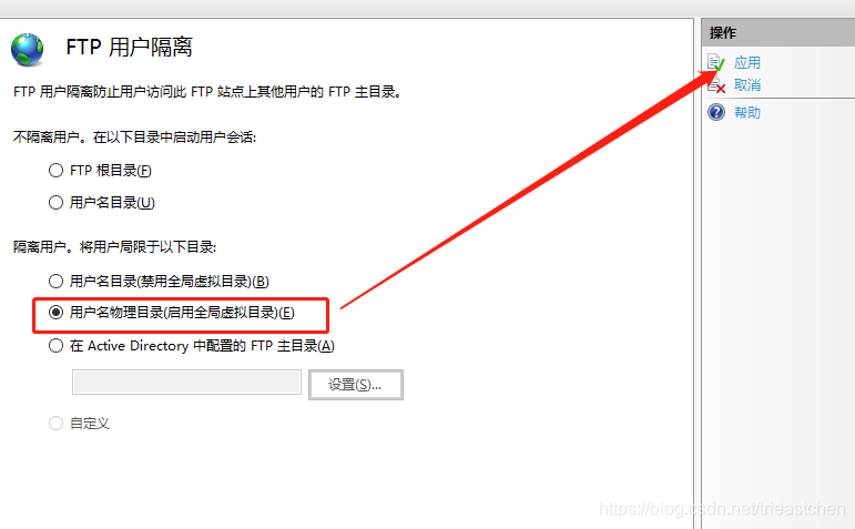 3)選中“用戶名物理目錄(啟用全局虛擬目錄)”,然后單擊右側應用