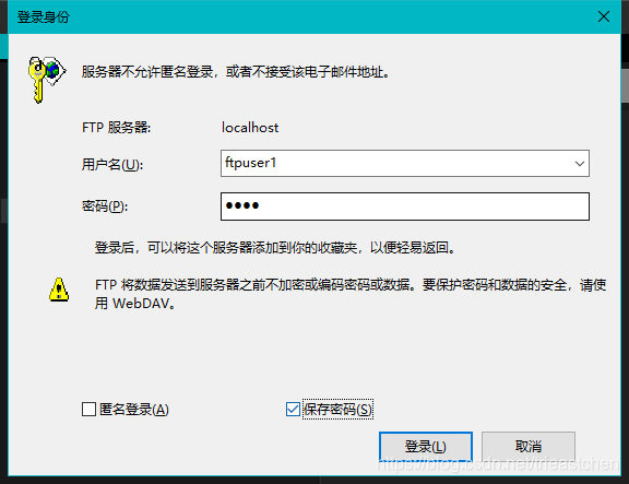 在彈出的對話框中輸入前面創建的FTP用戶名及密碼,單擊登錄