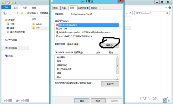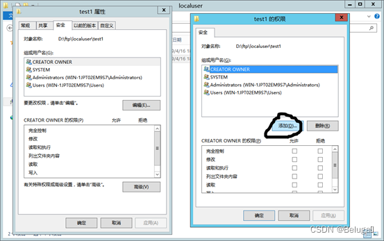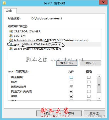 修改test1文件夾NTFS屬性,使test1用戶不僅有FTP的上傳下載權限,也可以對其修改刪除等完全控制權限。