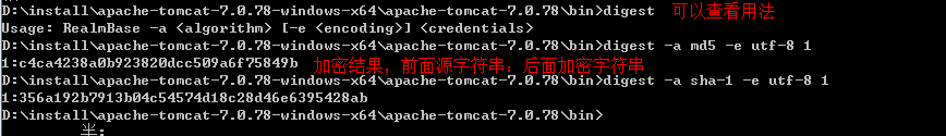 - digest -a md5 -e utf-8 1 (表示采用加密算法為md5,字符編碼為utf-8,加密字符串為1)