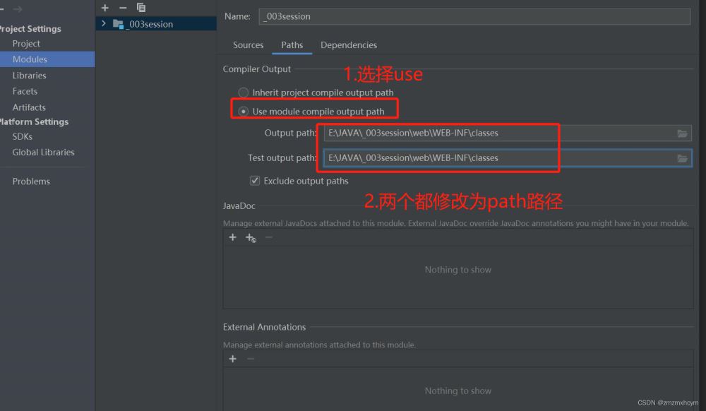 3.下面配置環境: File-> Project Structure-> Modules-> Paths-> 選擇第二個“Use”,修改兩個路徑均為classes路徑
