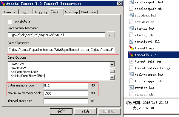 修改Initial memort pool跟Maximum memory pool的值,跟注冊表中修改的一樣和Xms與Xmx的值對應