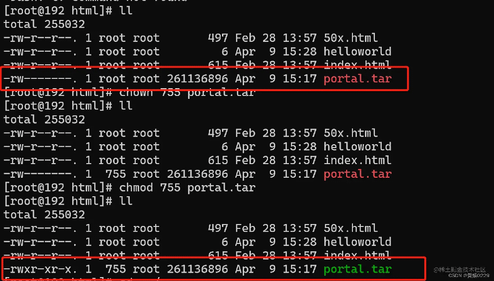 因?yàn)槲业膒ortal.tar文件沒有讀的權(quán)限,導(dǎo)致瀏覽器下載報(bào)403,使用 chmod 755 portal.tar 修改portal.tar文件的權(quán)限,如下圖: