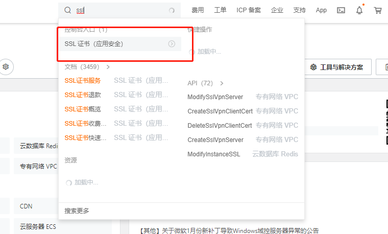 我就以我最常用的ssl證書為例,先登錄阿里云,進(jìn)入控制臺(tái)搜索ssl