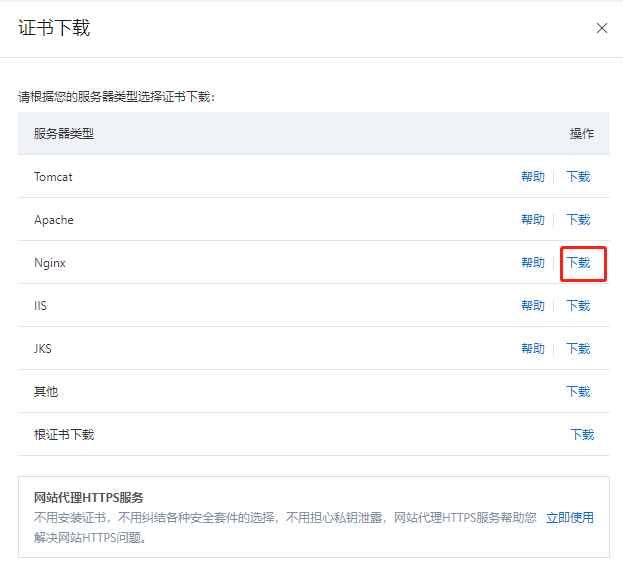 我這里是以Nginx作為反向代理,下載的證書類型是Nginx,所以前提是你的網(wǎng)站已經(jīng)使用了Nginx