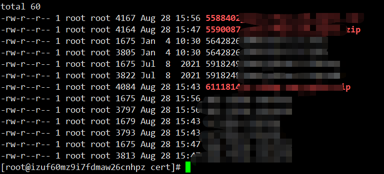 通過unzip命令解壓該文件,會(huì)得到兩個(gè)解壓文件,分別是以 .key和 .pem為后綴