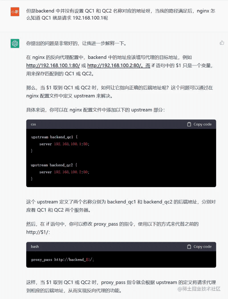 這個時候我大概明白了,只要我們拿到 $1 變量,就可以實現根據照片的文件名來反向代理服務器的請求。但是之前它提供的 upstream 配置中并沒有QC1和QC2對應的地址,還是繼續讓 ChatGPT 修改。