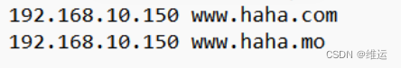 [root@nginx www]# vim /usr/local/nginx/conf/nginx.confworker_processes 1;events { worker_connections 1024;}http { include mime.types; sendfileon; keepalive_timeout 65;#通配符在后的域名 server {listen 80;server_name www.haha.*;location / { root /www/work_01; index index.html index.htm;}error_page 500 502 503 504 /50x.html;location = /50x.html { root html;} }#精確域名 server { listen 80; server_name www.haha.com; location / { root /www/work_02; index index.html index.htm; } error_page 500 502 503 504 /50x.html; location = /50x.html {root html; }}#通配符在前的域名 server {listen 80;server_name *.haha.com; location / {root /www/work_03;index index.html index.htm; } error_page 500 502 503 504 /50x.html; location = /50x.html {root html; }}#正則表達式域名 server {listen 80;server_name ~\w+.com; location / {root /www/work_04;index index.html index.htm; } error_page 500 502 503 504 /50x.html; location = /50x.html {root html; }}}[root@nginx www]# systemctl restart nginx#配置宿主機host文件,在"C:\Windows\System32\drivers\etc\hosts"