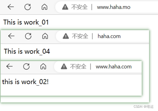 [root@nginx ~]# cd /www/[root@nginx www]# mkdir work_03[root@nginx www]# mkdir work_04[root@nginx www]# echo "This is work_03" > work_03/index.html[root@nginx www]# echo "This is work_04" > work_04/index.html[root@nginx www]# lswork_01 work_02 work_03 work_04