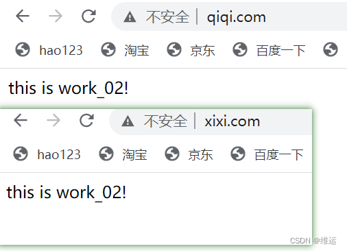 #兩個不同文件夾,分別存放不同文件[root@nginx ~]# mkdir /www/work_01 -p[root@nginx ~]# mkdir /www/work_02[root@nginx ~]# vim /www/work_01/index.html this is work_01![root@nginx ~]# vim /www/work_02/index.htmlthis is work_02!