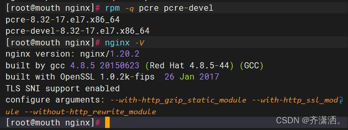 首先根據(jù)提示我們知道nginx無法解析rewrite,(未知的指令“rewrite”),我想著應(yīng)該是模塊沒裝,或者其依賴pcre、pcre-devel沒裝(大家排查的時候也可以看看這兩個依賴)。然后我檢查了一下依賴(圖一)。確實好像沒啥問題,該裝的都裝了。我知道肯定是編譯或者依賴的問題,然后我就打開了百度。