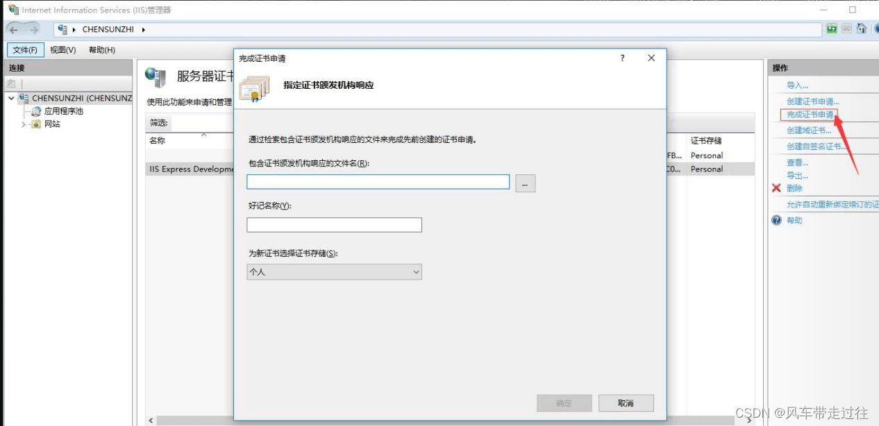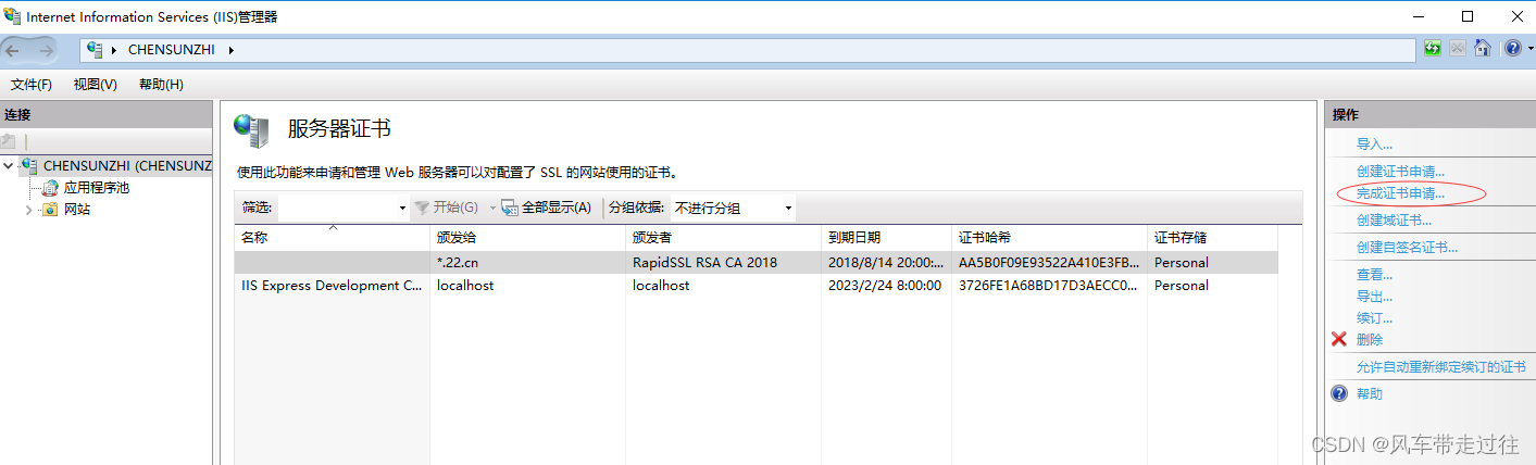在IIS中,選中左側根節點,在右側”功能視圖“中,打開“服務器證書”,在最右側的“操作”窗口,點擊”完成證書申請…”,如下圖所示: