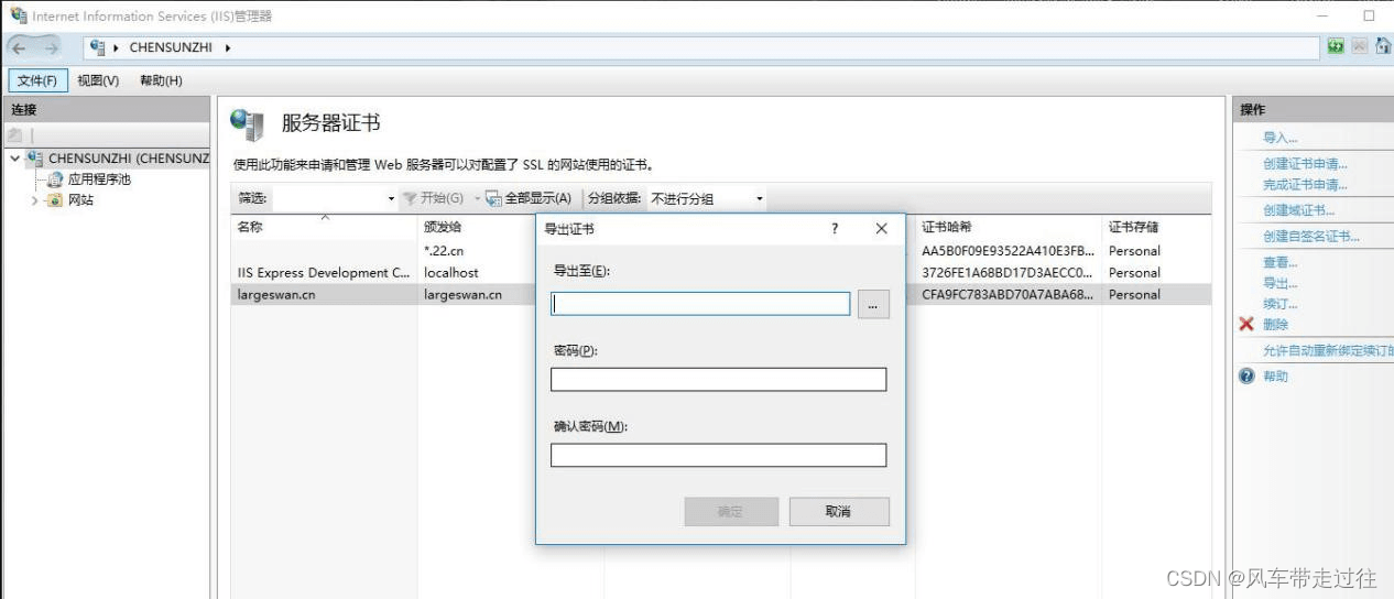 選中剛導入的證書,導出證書備份*.pfx.此文件可用作證書備份,及在其他機器中直接導入使用(在IIS中,選中左側根節點,在右側”功能視圖“中,打開“服務器證書”,在最右側的“操作”窗口,點擊”導入”,如果攜帶中級證書,其他機器先部署中級證書)。如下圖所示:
