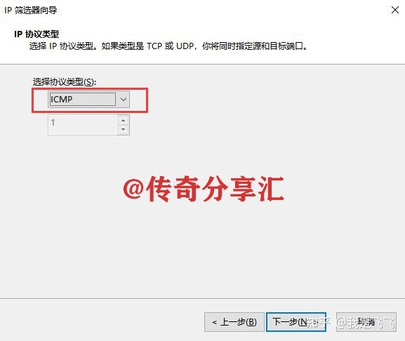 5、協(xié)議類(lèi)型選中ICMP,然后點(diǎn)擊下一步、完成