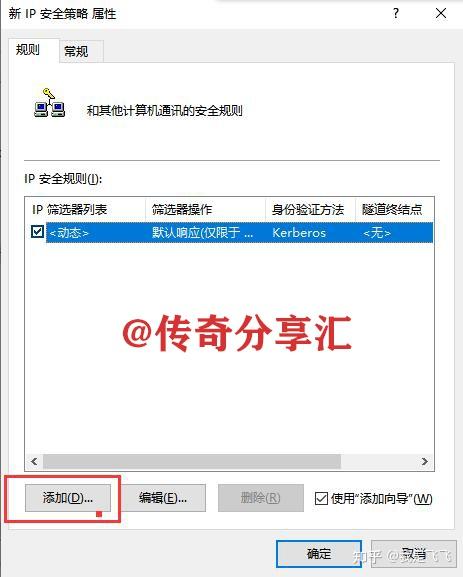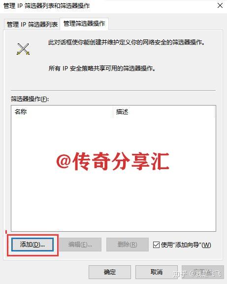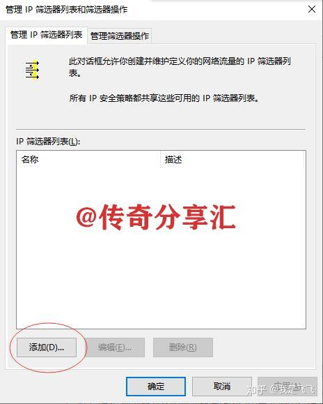 3、在管理IP篩選器列表和篩選器操作窗口中首先選中管理IP篩選器列表選項(xiàng)卡,然后在下方點(diǎn)擊添加,在彈出的窗口中再次點(diǎn)擊添加