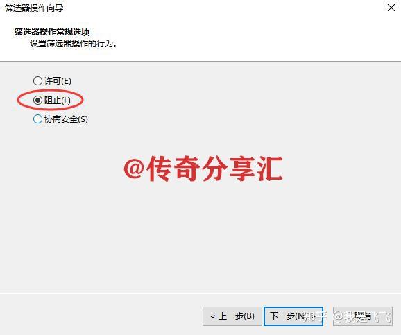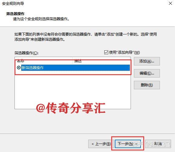 7、在管理篩選器操作選項(xiàng)卡下方找到并點(diǎn)擊添加,在新篩選器操作屬性窗口上方勾選阻止,然后依次點(diǎn)擊確定返回