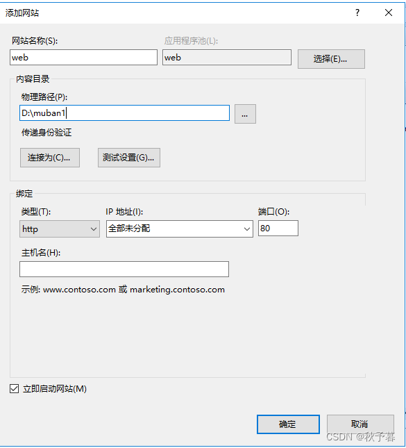在彈出的“添加網站”對話框中,網站名輸web,“物理路徑”D:\muban1