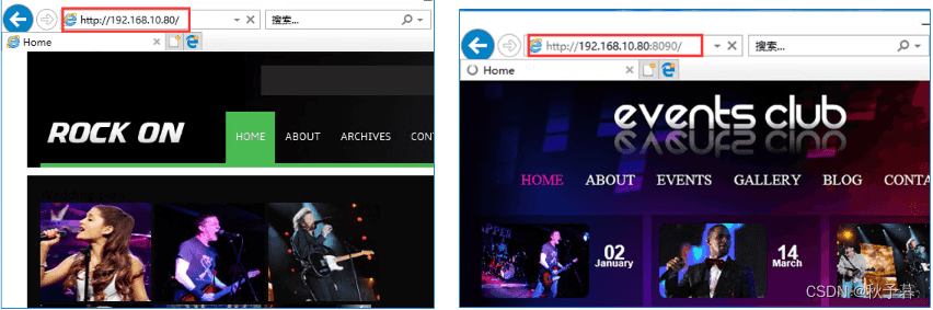 在IIS服務器上建立兩個虛擬Web主機:muban1–> 物理路徑D:\muban1(配置默認80端口)muban2–> 物理路徑D:\muban2(配置8090端口)從瀏覽器訪問這兩個網站:http://192.168.10.80/http://192.168.10.80:8090