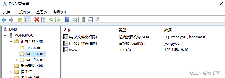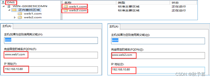 在DNS服務器上注冊兩個域名,都指向IIS服務器的地址www.web1.com的IP地址 192.168.10.80www.web2.com的IP地址 192.168.10.80