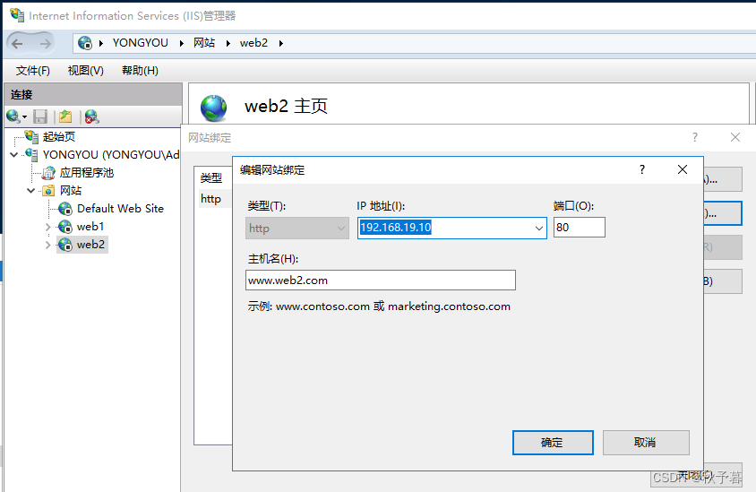 2)右擊網站添加網站,站點名為web2,物理路徑D:\web2,訪問IP地址192.168.19.10,端口號為80,主機名為www.web2.com