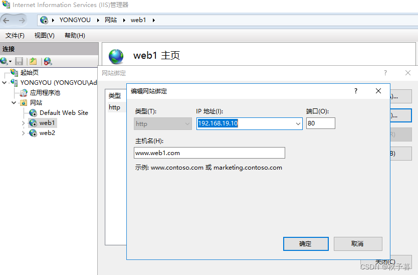 1)右擊網站添加網站,站點名為web1,物理路徑D:\web1,訪問IP地址192.168.19.10,端口號為80,主機名為www.web1.com