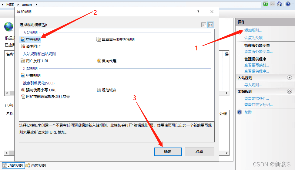 1.添加入站規(guī)則安裝完成后重新打開IIS,在部署的網(wǎng)站主頁(yè)會(huì)多出一個(gè)“URL重寫”的功能模塊,雙擊打開后依次點(diǎn)擊:添加規(guī)則——空白規(guī)則——確定(以下部分截圖來(lái)自網(wǎng)上)。