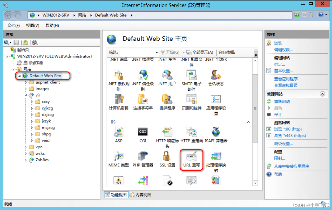 安裝完成后,退出IIS管理器并重新打開它,在網(wǎng)站主頁(yè)上會(huì)發(fā)現(xiàn)多了一個(gè)“URL重寫”模塊: