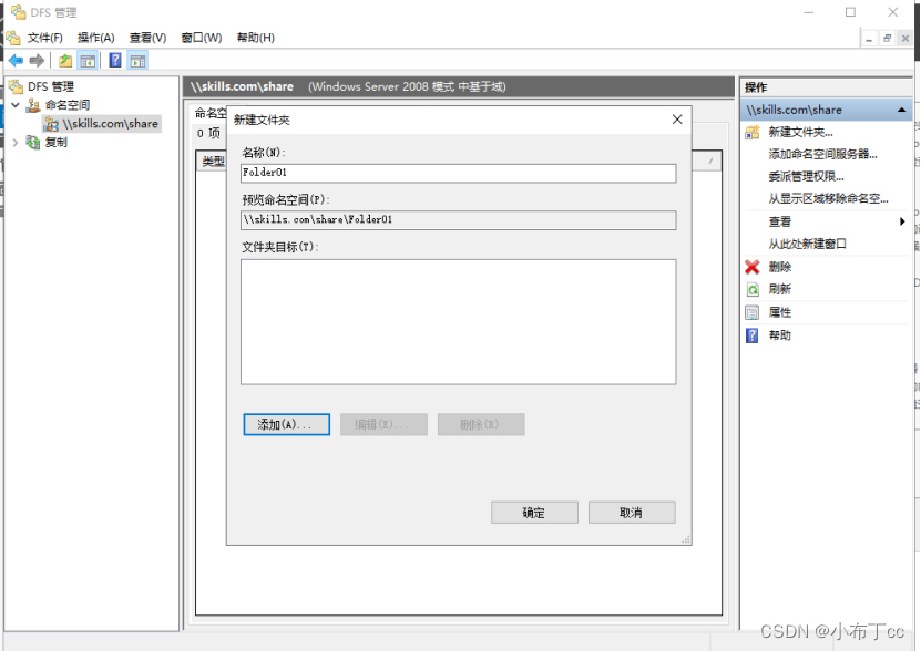 點(diǎn)DFS管理服務(wù),點(diǎn)擊創(chuàng)建好的文件夾,點(diǎn)擊添加共享文件夾目標(biāo),找到剛才創(chuàng)建好的目錄