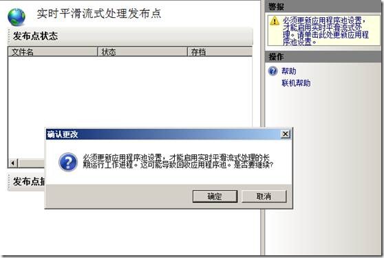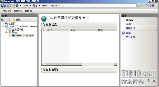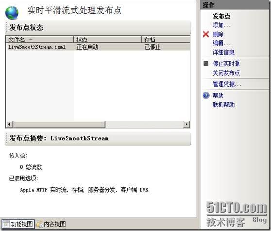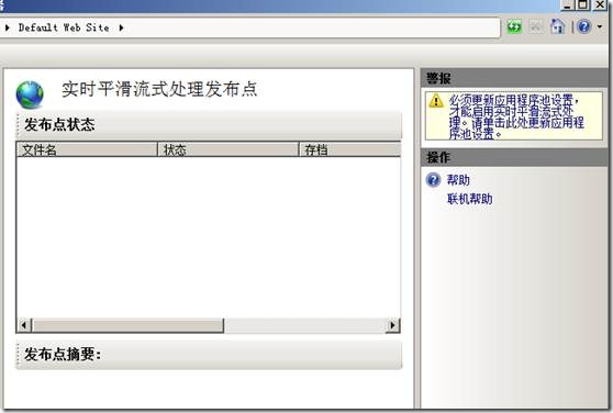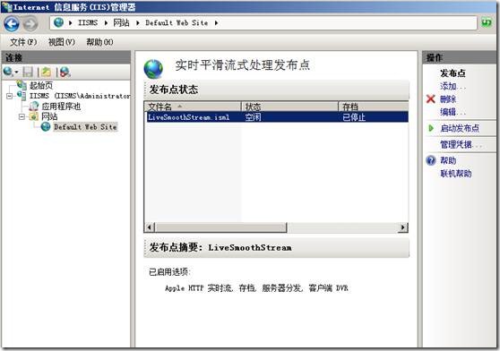 當從發布點開始接受Expression Encoder Pro編輯器發來的數據之后,它的狀態將變成State。需要在IIS 管理器中刷新Live Smooth Streaming發布點頁面,才能看到這個狀態的改變。