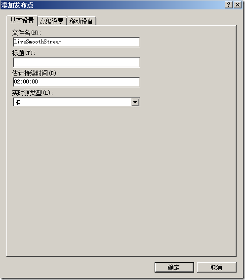 文件名:為Live Smooth Streaming發布點的定義文件輸入一個名稱