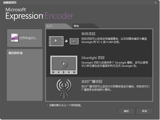 三、配置Expression Encoder Pro視頻采集計算機1、 在視頻采集計算機上打開Microsoft Expression Encoder Pro 4.0,在 “加載新項目”對話框選擇“實時廣播項目”。