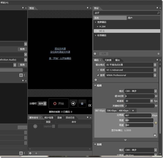 3、 點擊右側“預設”面板,為Live Smooth Streaming直播方案選擇可調整的編碼速率和編碼格式。在“編碼”選項卡中選擇“IIS 平滑流式處理”。可以自定義輸出格式、視頻、音頻格式。