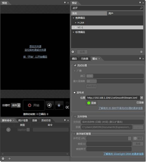 此處是等待從Expression Encoder Pro編輯器中發來的直播平滑流式媒體數據。