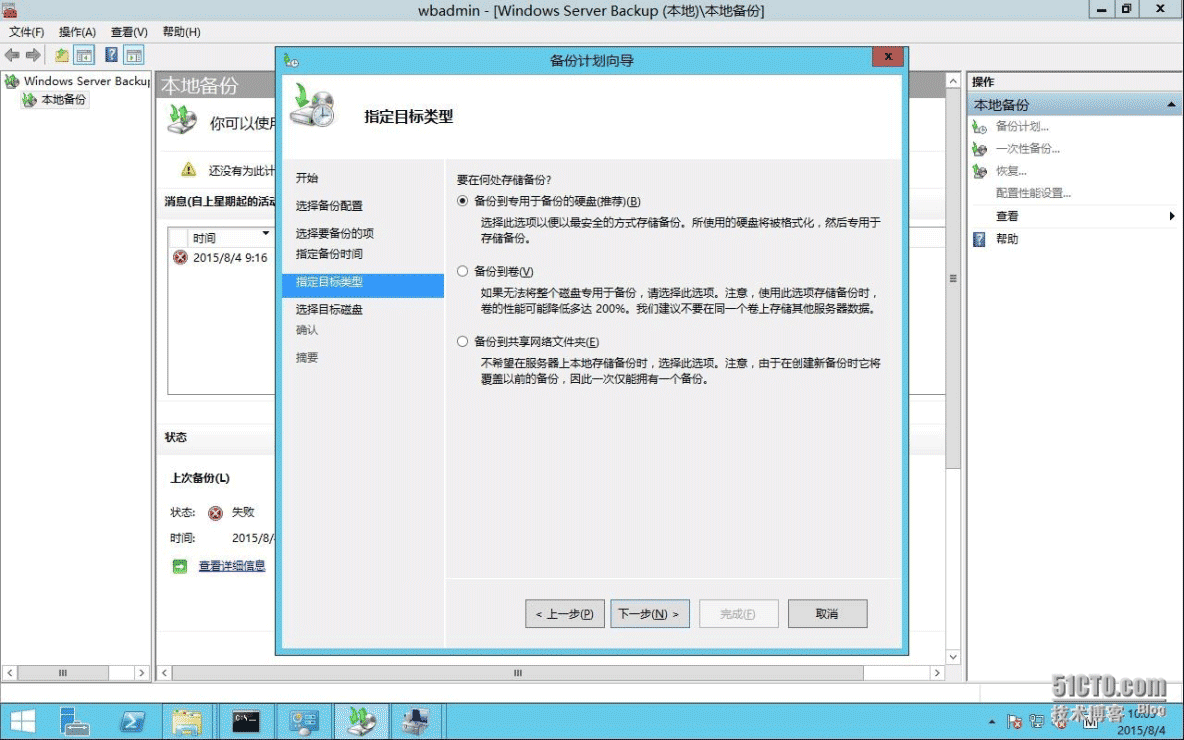 6、指定目標類型,選“備份到專用于備份的硬盤(推薦)”(測試中選擇此種存儲備份,大家可以結合實際來存放備份文件,比如網絡文件夾,NAS存儲之類)