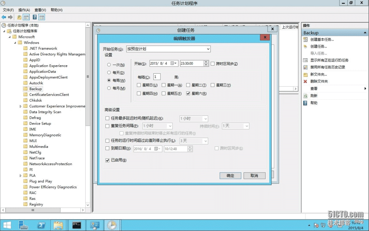13、導入周備份(weekbackup),右鍵備份任務計劃,選“屬性”—“觸發器”—選“編輯”,可以在編輯觸發器界面,更改備份周期,現更改為每周,星期六 23:30:00開始備份。(每周備份選擇周六)