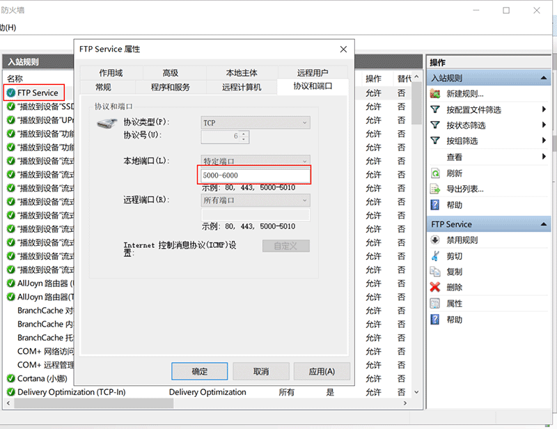 為了解決P端口的放行不被服務器防火墻攔截,需要在服務器端設定P端口的范圍,并在防火墻中開啟這個范圍端口的放行。下圖是FTP服務器中指定被動模式的數據端口范圍為5000-6000,然后在Windows防火墻中配置5000-6000端口允許放行。