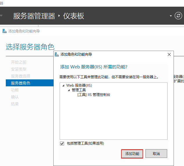 1)打開【服務器管理器】,點擊【添加角色和功能】。