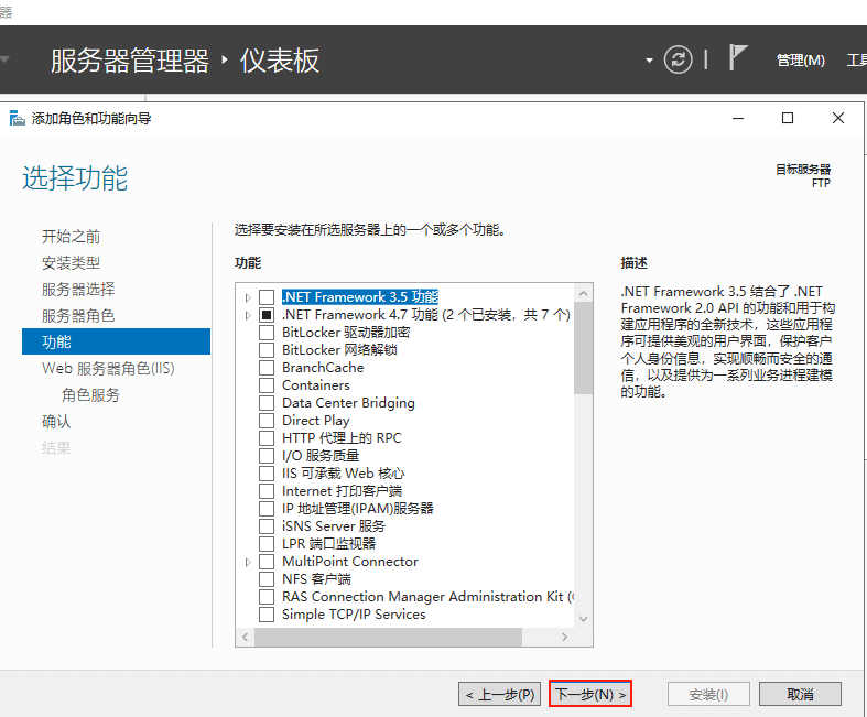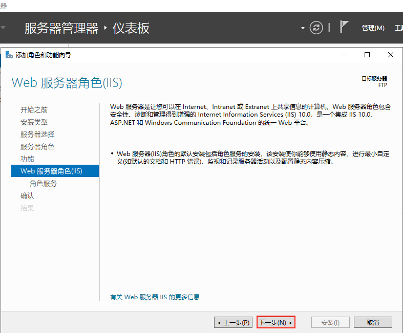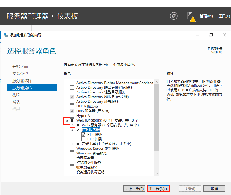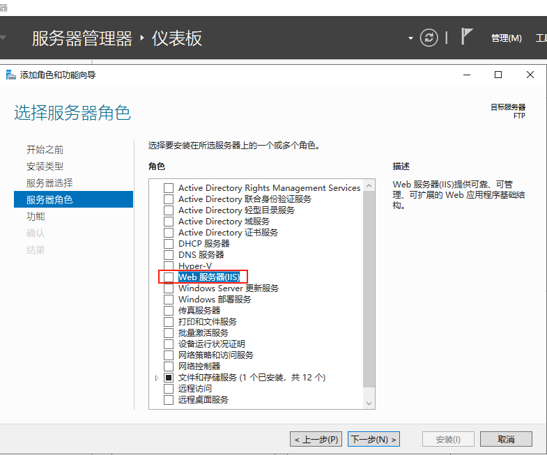 1)如果之前已經安裝了IIS,但沒有安裝FTP服務,可以在服務器管理器中點擊【添加角色和功能】,一路點擊【下一步】直至【服務器角色】界面。找到【Web服務器(IIS)】,點擊其左側【?】符號,勾選【FTP服務器】即可。
