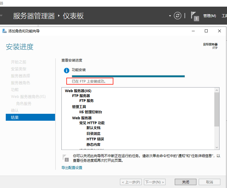 10)進入【結果】界面,等待一段時間后,系統提示FTP安裝完成后,即可以關閉安裝界面。