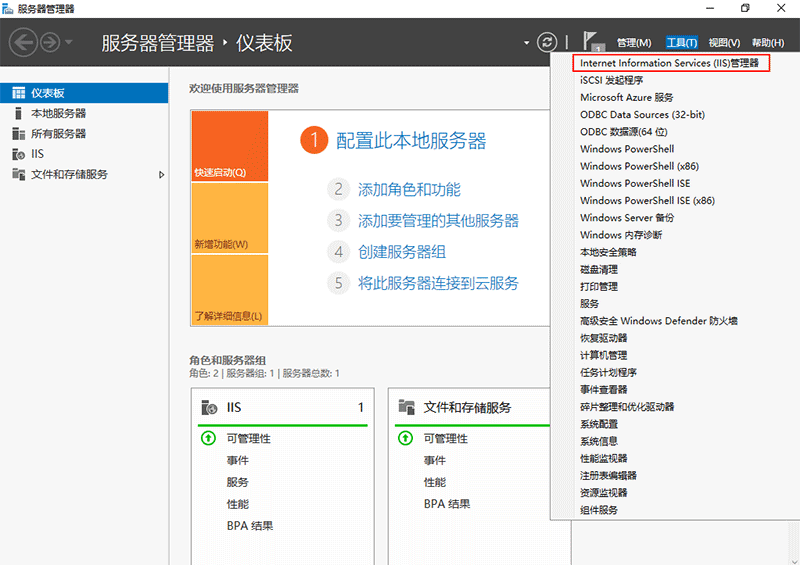 1)打開【服務器管理器】,點擊右上角的【工具】欄,找到【Internet Information S ervices(IIS)管理器】點擊。